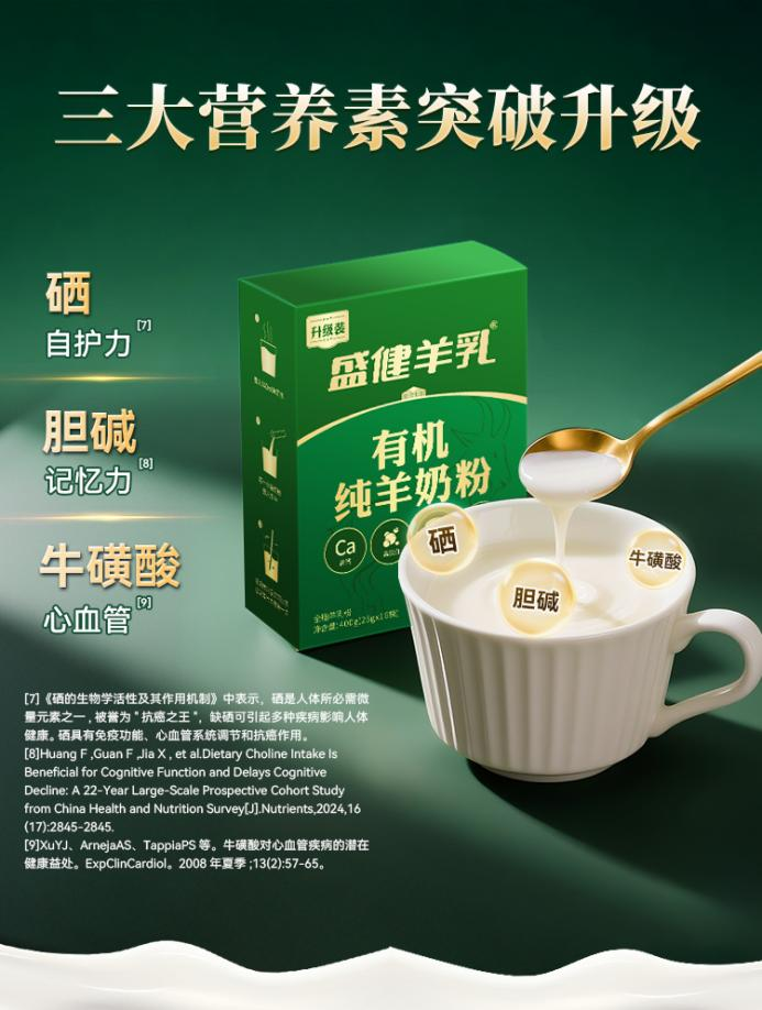 盛健羊乳有机纯羊奶粉升级装以高钙高蛋白筑牢基础营养,靠牛磺酸、胆碱等核心营养素针对性解决成年人健康痛点,再结合便捷的包装设计,完美适配成年人快节奏的生活方式。这款产品让“秋冬进补”不再成为负担,更让成年人在忙碌之余,能轻松获取充足营养,养出好状态、喝出精气神,以更健康的身体应对工作与生活的双重挑战。